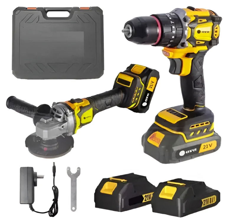 Incluye: Maletin - 2 Bateria 21v - Cargador - Taladro - Amoladora - Pieza para Ajustar Disco (NO Incluye Disco) - Manual
