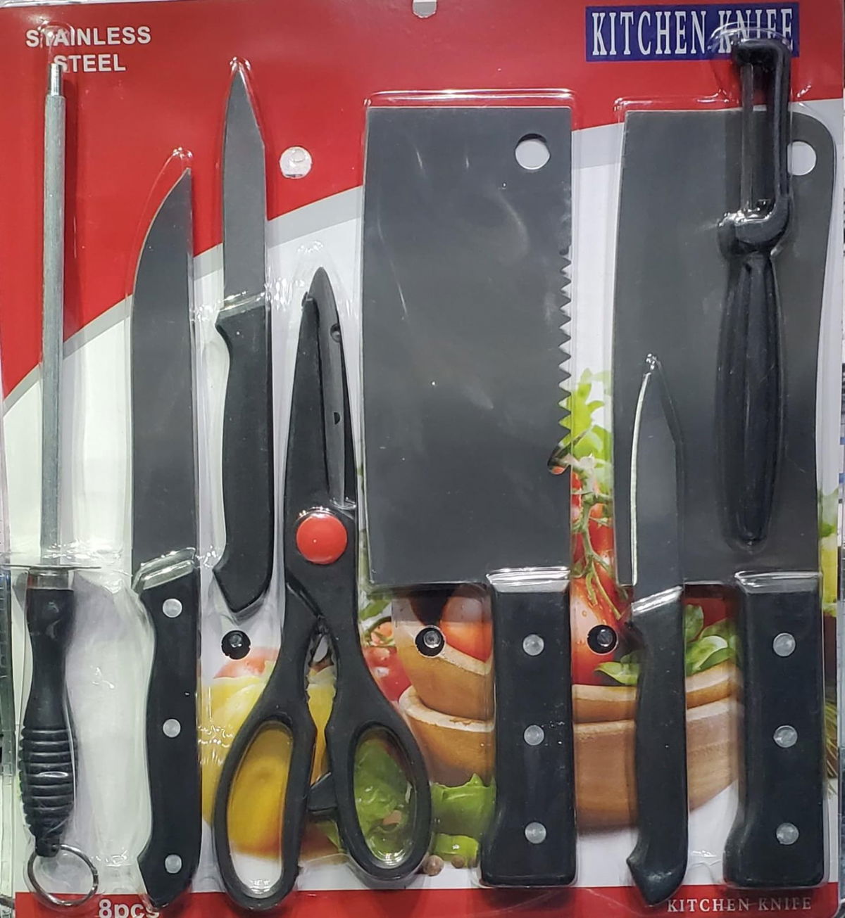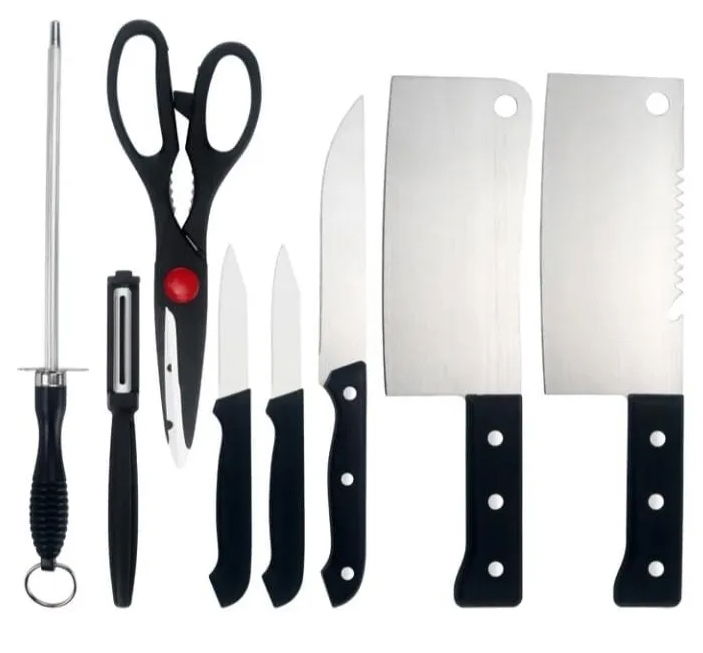 8 Piezas: 2 x Cuchillo Chico de 17,7cm (c/u) - 1 Cuchillo Largo de 24,1cm - 1 Afilador Chaira de 26cm - 1 Tijera de 21,5cm - 1 Pela-Papa de 16cm - 2 Cuchillo Chef Chino de 25,5cm