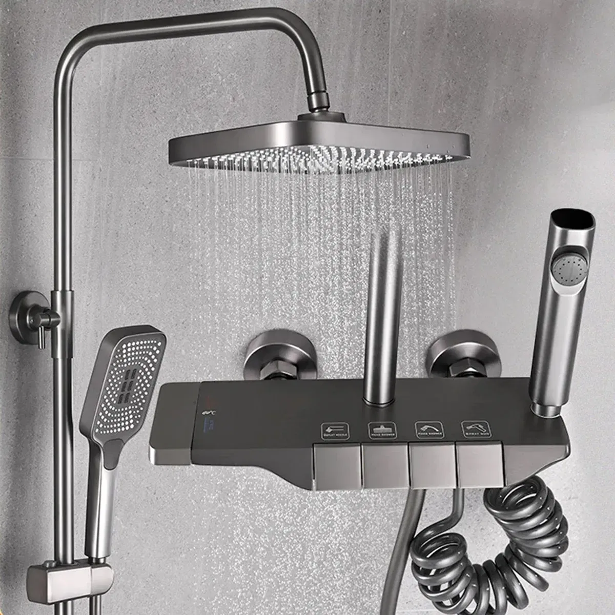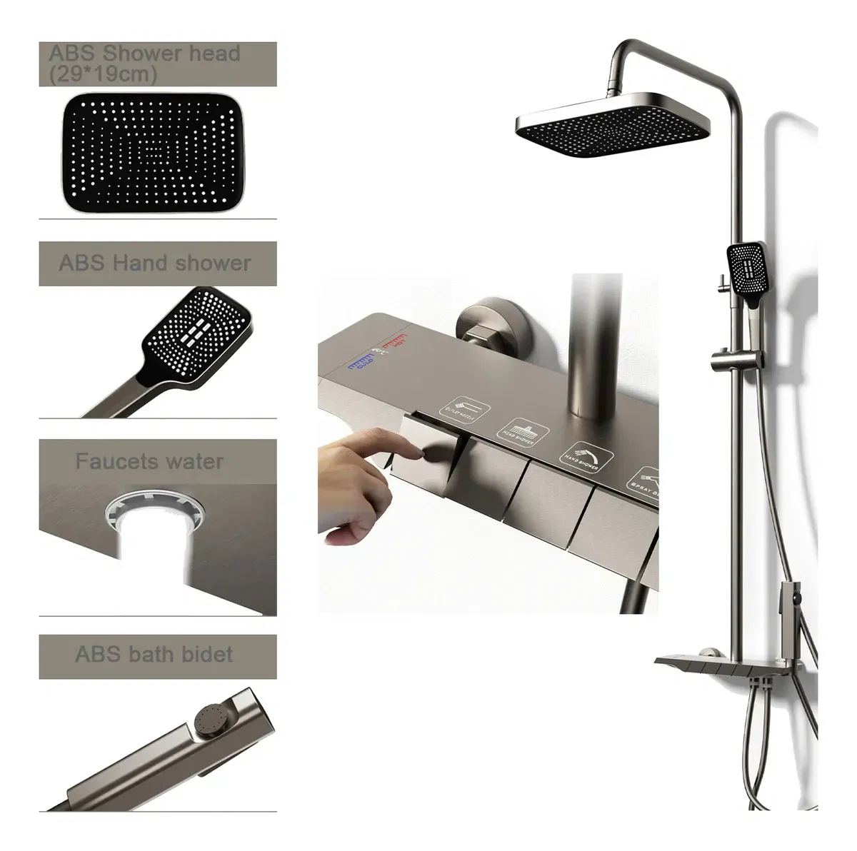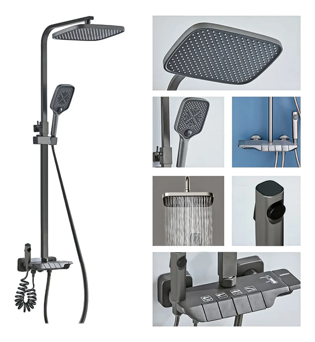 Características: • Cabezal tipo lluvia de gran tamaño: Cobertura total para el cuerpo con tecnología de inyección de aire que hidrata y refresca la piel. • 4 Tipos de Ducha: Uso combinado o independiente de las diferentes funciones, adaptándose a las preferencias del usuario. • Ducha de mano ergonómica: Con modos de chorro ajustables para tareas específicas o relajación. • Materiales duraderos: Latón y ABS resistentes al desgaste, con acabado anticorrosión que mantiene su brillo y elegancia. • Sistema de instalación rápida: Incluye todos los accesorios necesarios para una instalación sencilla.